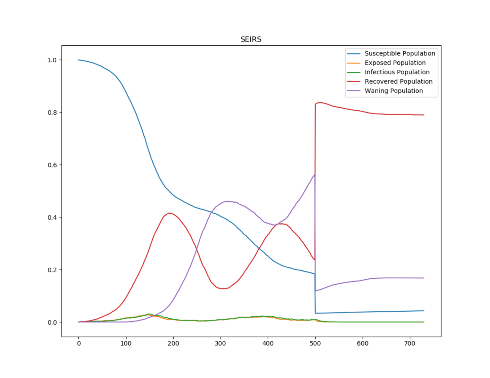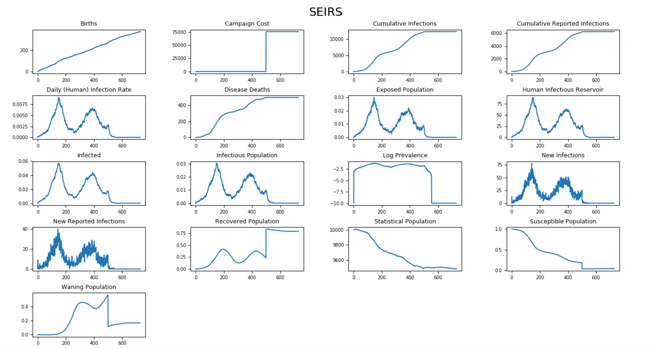 The following graphs show the complete trajectory of a fatal SEIRS outbreak: the disease endemicity due to vital process and waning immunity and the effect of vaccination campaigns that eradicate the outbreak after day 500. To run this example simulation, see the Generic/SEIRS scenario in the downloadable EMOD scenarios zip file. Review the README files there for more information. For more information on creating campaigns, see Creating campaigns.