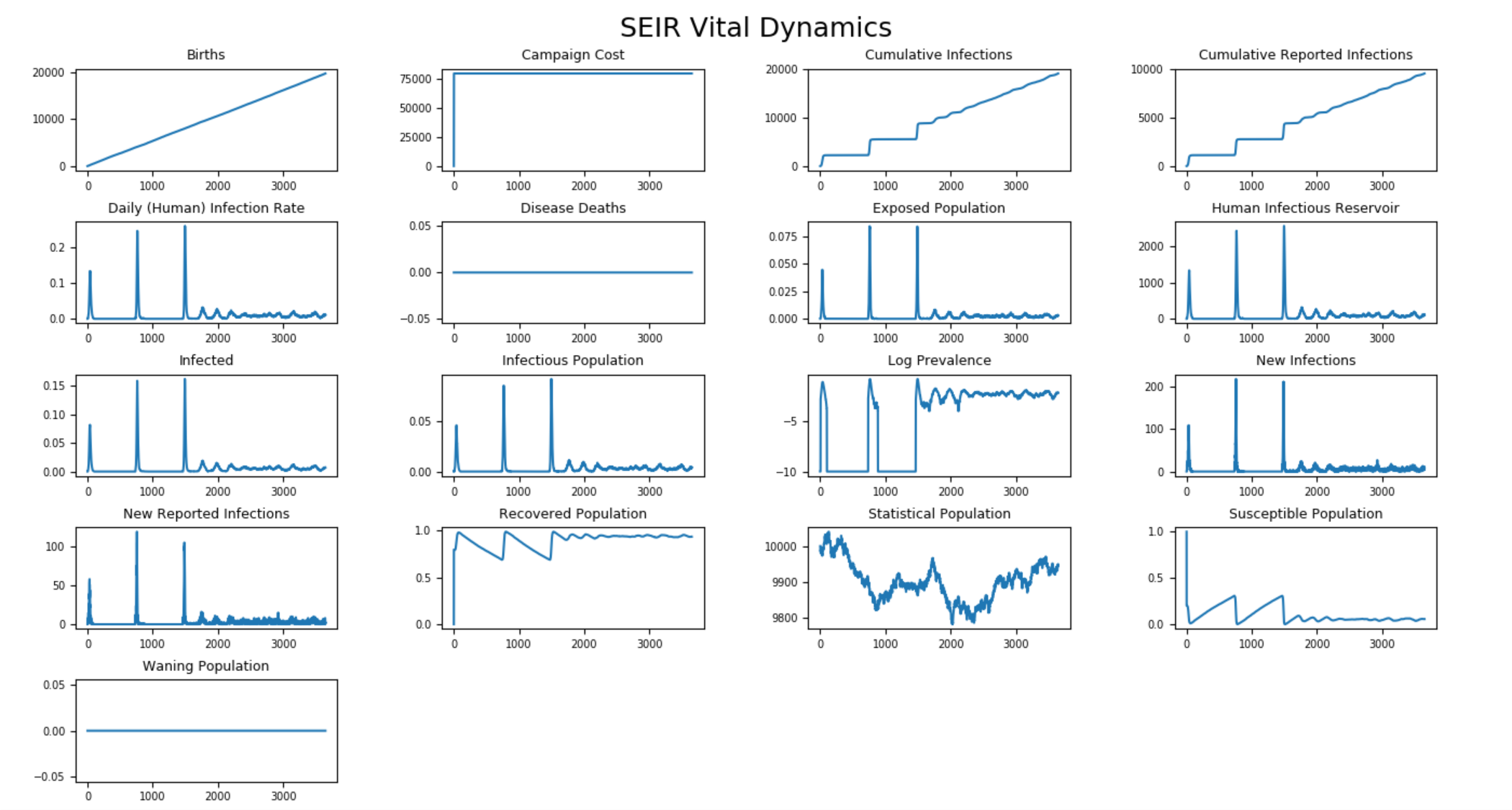 The following graphs show periodic reintroductions of an SEIR outbreak in a population with vital dynamics. To run this example simulation, see the Generic/SEIR_VitalDynamics scenario in the EMOD scenarios folder. Review the README files there for more information.