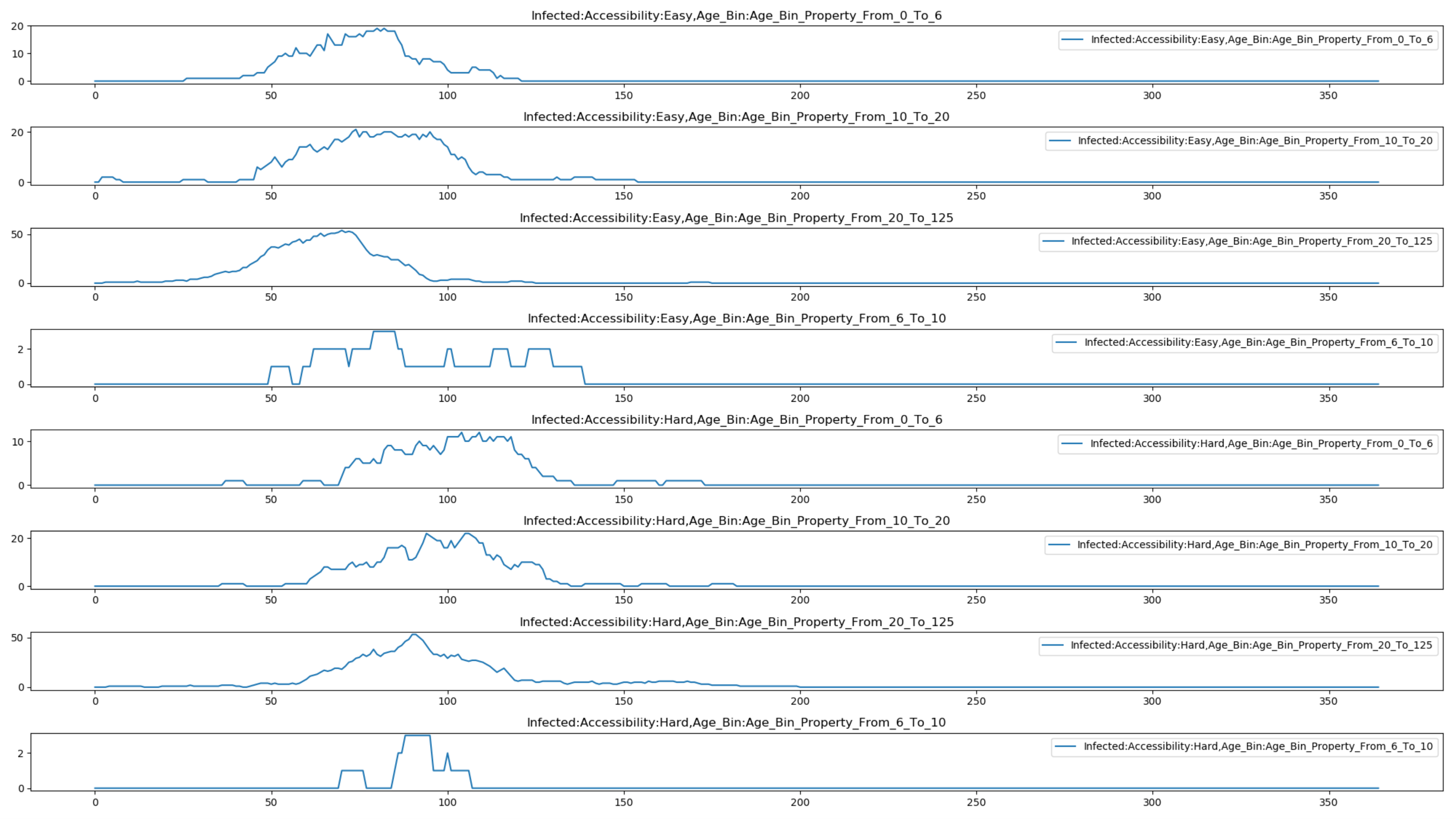 The following graphs show the property reports for a HINT simulation with both age and accessibility properties in which transmission is lower for hard-to-access individuals and there are an equal number of “easy” and “hard” to access individuals. The first graph shows the effect of targeting vaccination to children aged 6 to 10. The second graph shows the effect of instead targeting it to all individuals who are easy to access.